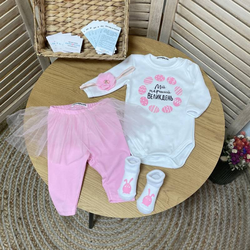 Зберіть незабутні спогади про перший Великдень вашої маленької принцеси за допомогою нашого чарівного комплекту дитячого одягу з ніжним написом "Перший Великдень". Цей чудовий комплект створений для створення незабутнього святкового настрою і зробить святкування особливим.