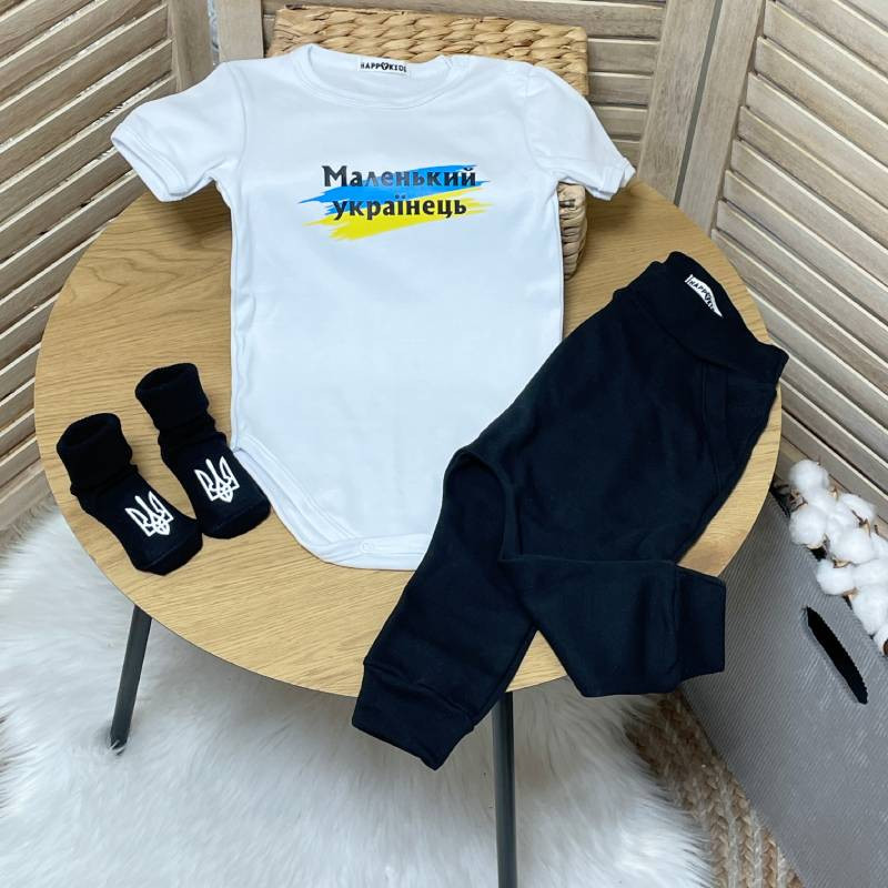 Якісні боді з принтом для маленьких чудово доповнюються штанами, шапочкою та патріотичними шкарпетками.