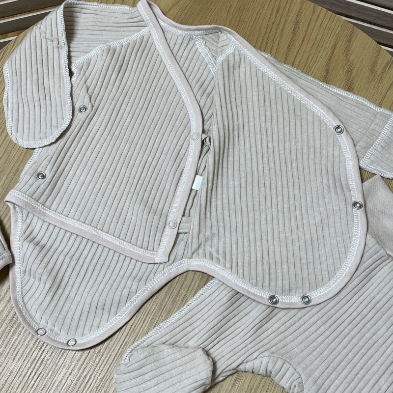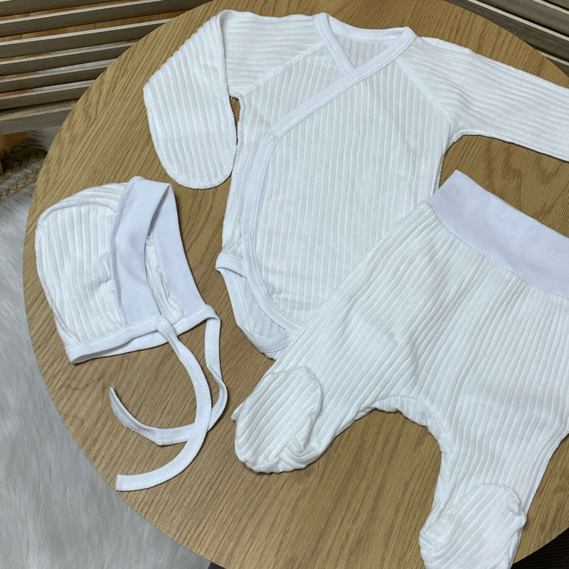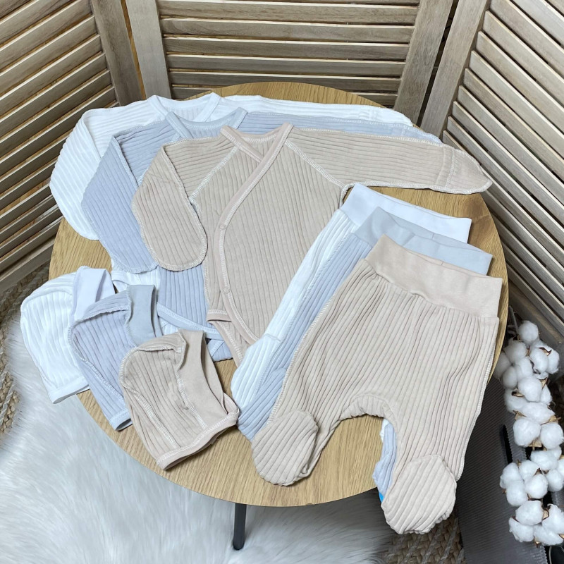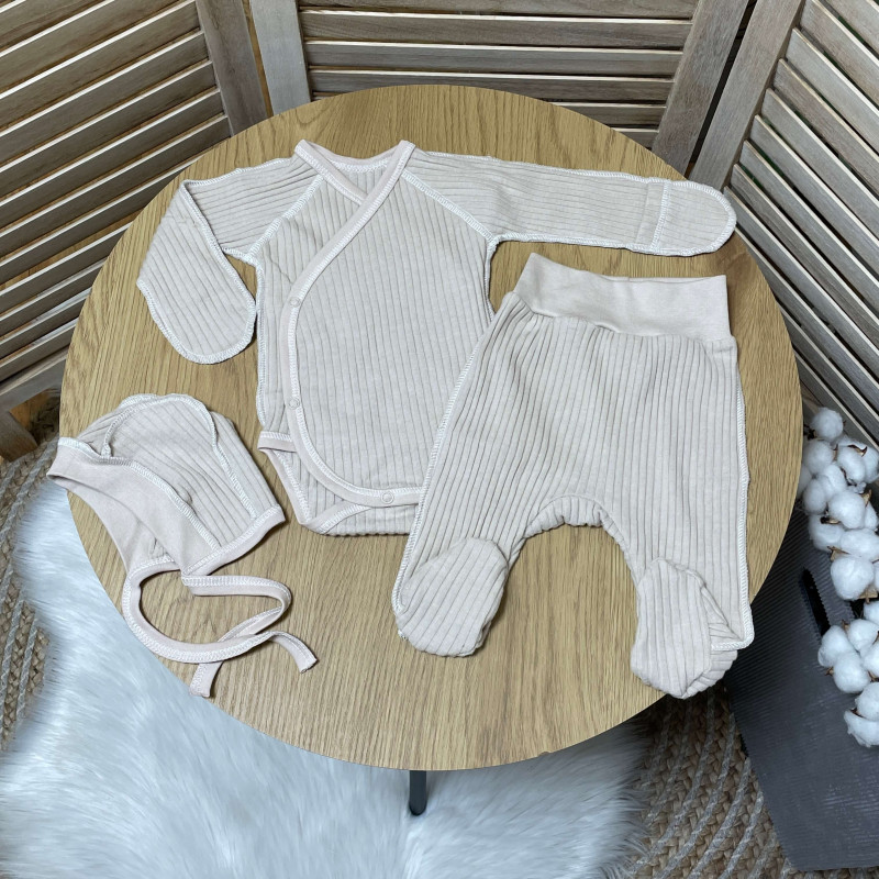 Чудовий комплект для новонароджених - рубчиком, боді, штанами та шапочкою, який стане незамінним доповненням до гардеробу вашої малечі.