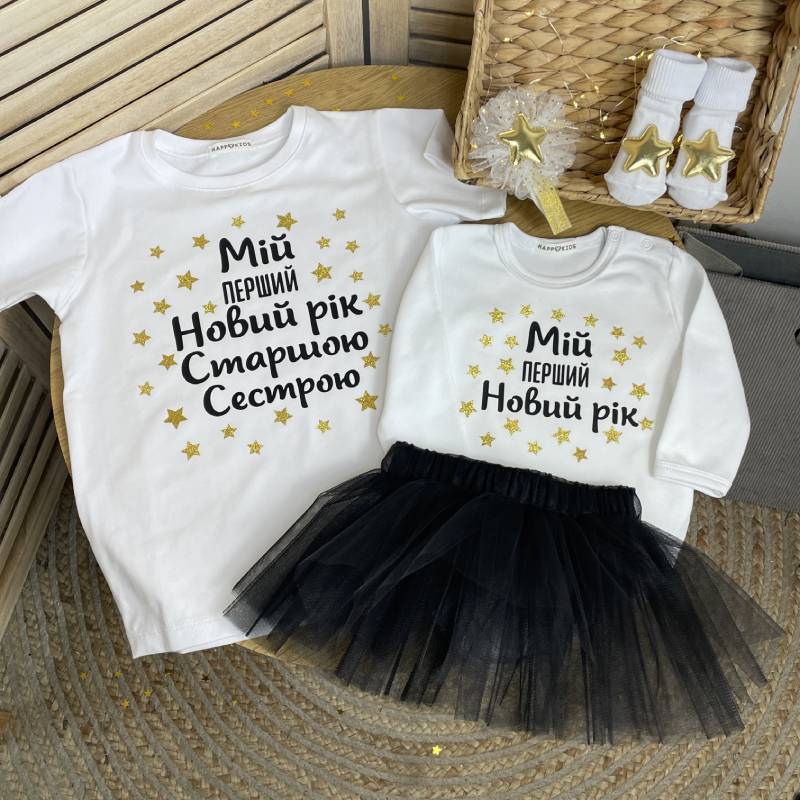 Новорічний комплект для сестричок "Перший Новий рік старшою сестрою / Мій перший Новий рік" — це ідеальний сімейний образ для святкових фото та незабутніх моментів. Такий сет підкреслить родинну атмосферу тепла, любові та радості, а фото з ним стануть справжньою прикрасою сімейного альбому.