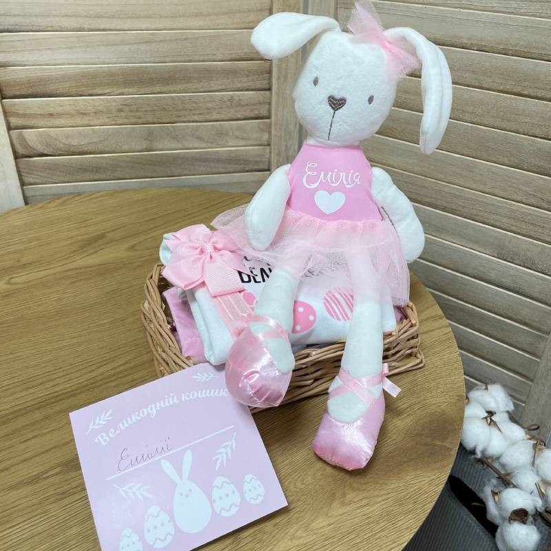 - Комплектація: В комплект входить боді, лосини зі спідничкою, бантик, зайка з іменем дитини.