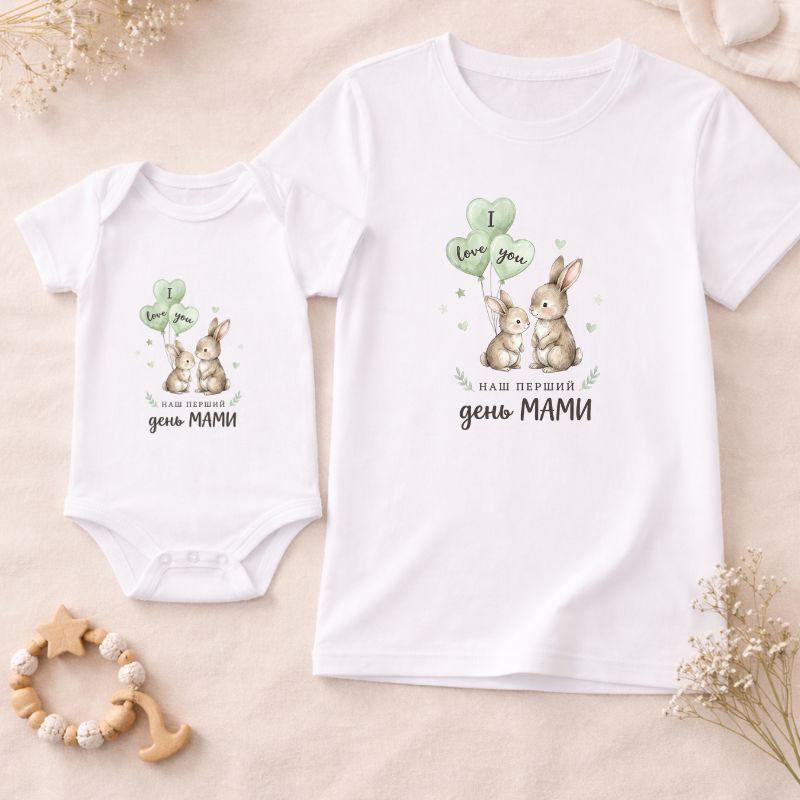 Дизайн: комплект у ніжному стилі з написом «Наш перший День Мами» та милим принтом зайчиків; гармонійне поєднання для family look мама і дитина