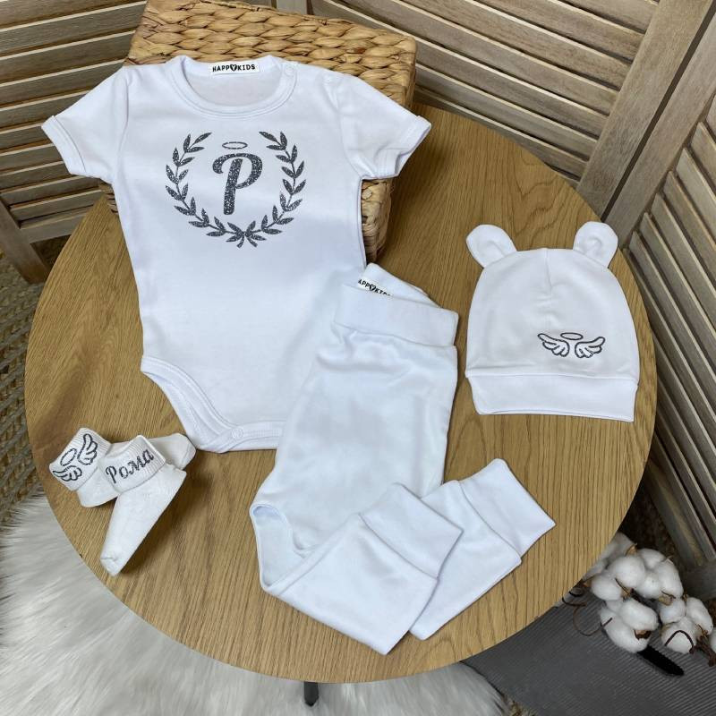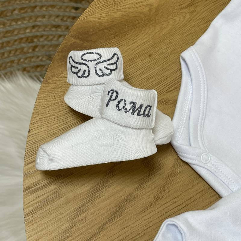 - Шкарпетки з іменем дитини/на другом німб з крилами