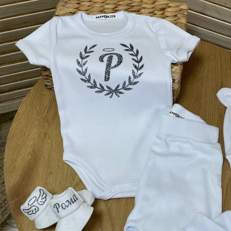 Комплект з блискучими крилами та ініціалами дитини с боді глітер