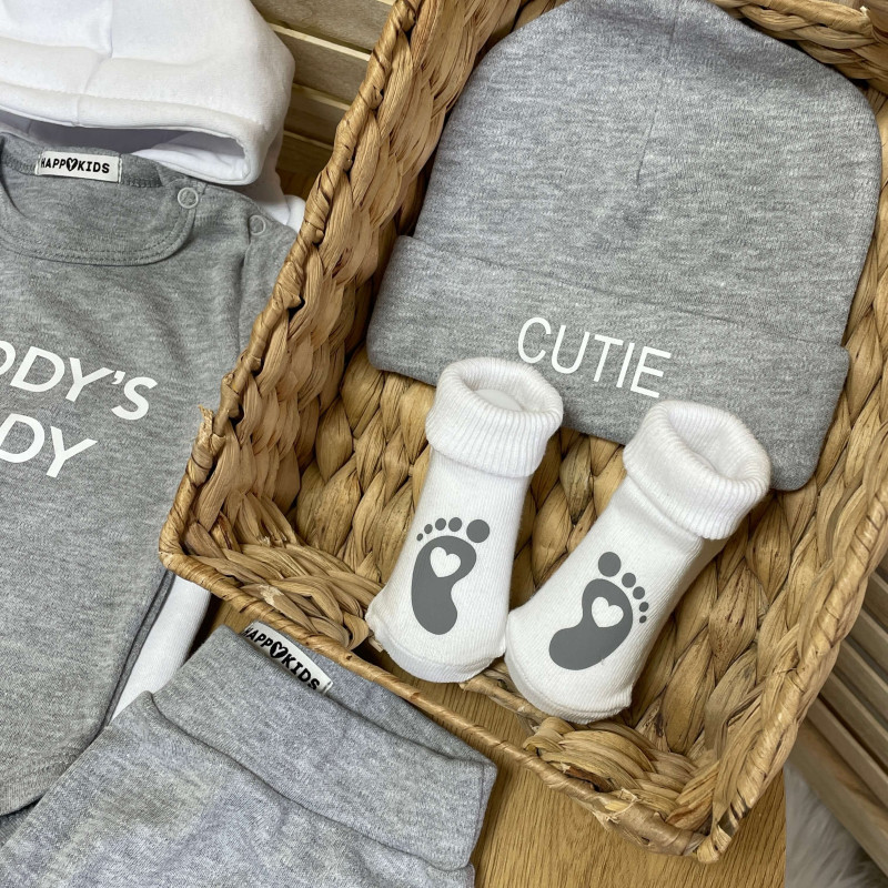 Комплект найнеобхідніщого одягу для новонароджених з оригінальним принтом для хлопчика. Стильний принт і прикольний напис на боді та аксесуари, що ідеально доповнюють одне одного.