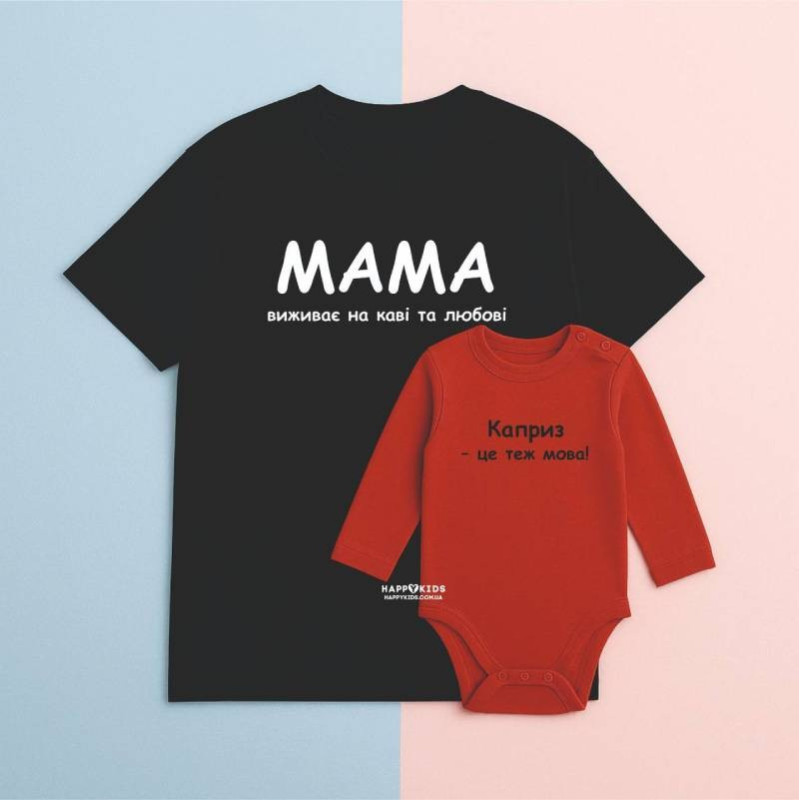 Наш набір з футболкою для мами та боді для новонародженого з написом "Мама виживає на каві і любові" — це не просто одяг, а настрій, у якому впізнає себе кожна мама.