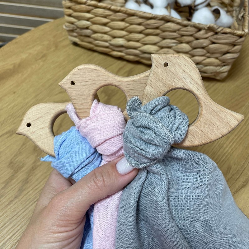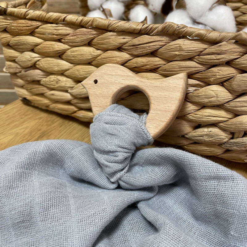 Гризунець може бути персоналізований з іменем вашої дитини, що робить його чудовим подарунком на народження або хрестини. Крім того, в комплекті з гризунцем йде дерев'яна пташка з хусткою муслін, яка може бути використана як додатковий гризунець або як звичайна іграшка.