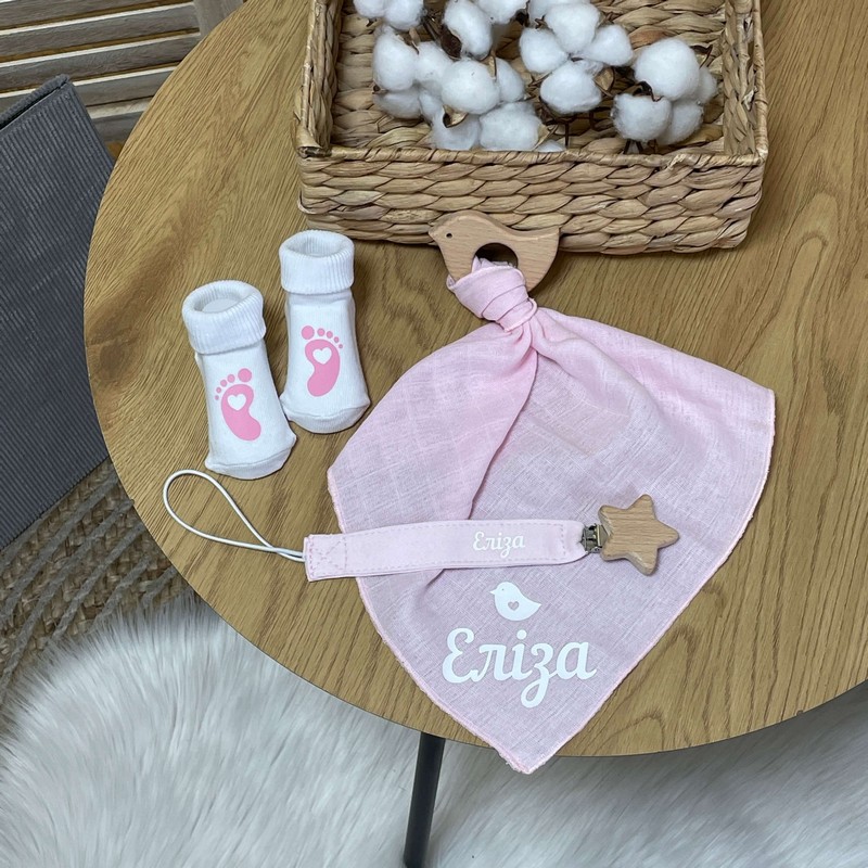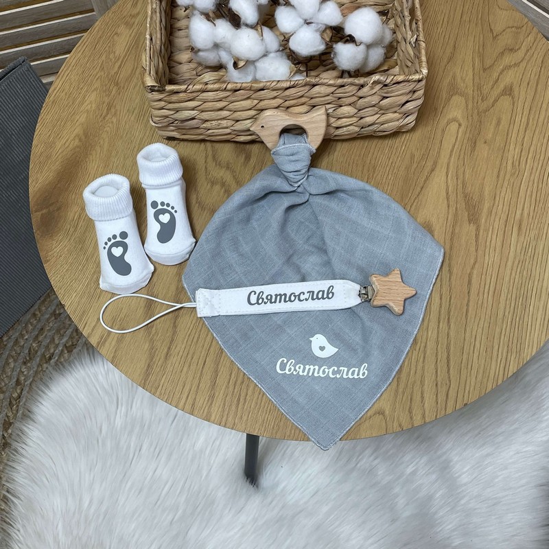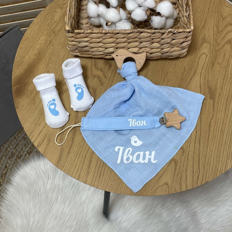 Набір новонародженому іменний тримач, гризунець, носочки