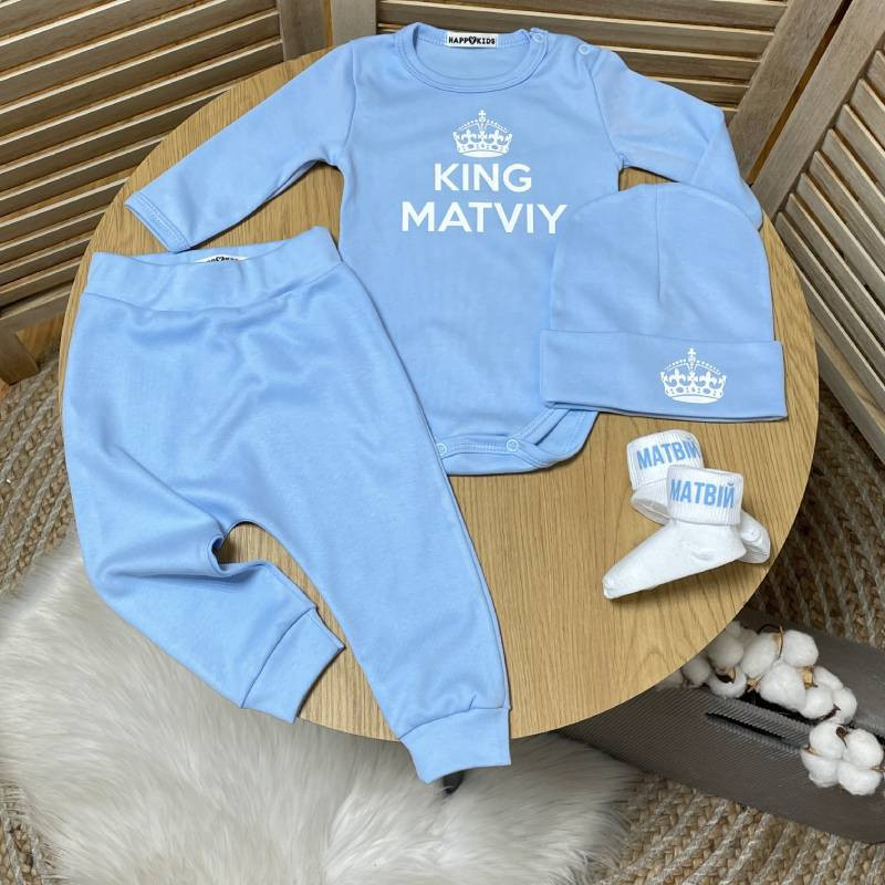 Подаруйте вашому маленькому королю неповторний стиль і комфорт з іменним набором одягу "KING". Ідеальне поєднання елегантності та практичності, цей набір стане чудовим вибором для виписки, фотосесії або як унікальний подарунок для новонародженого.