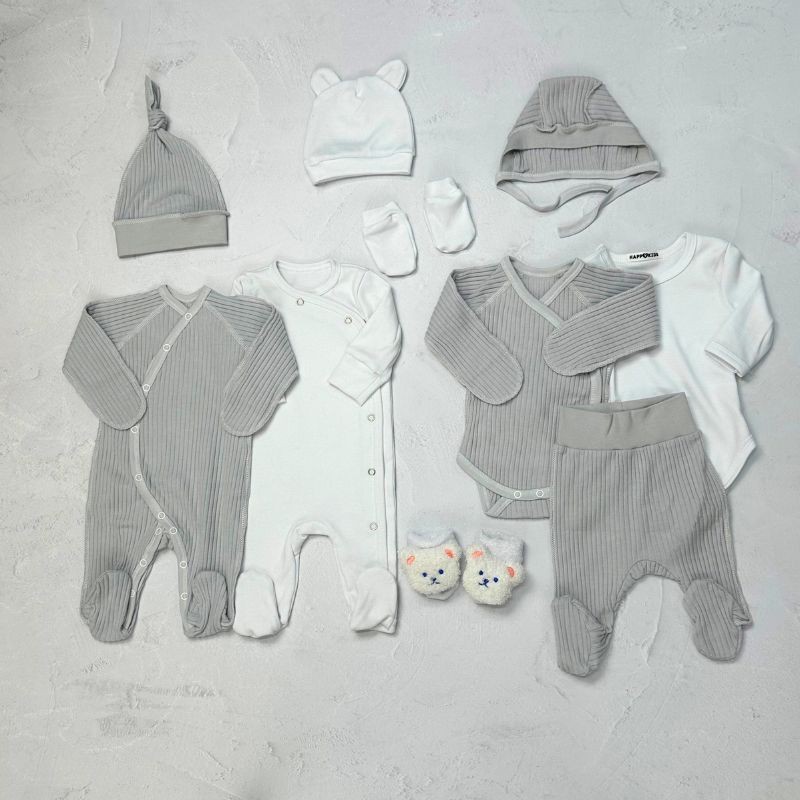 Набір одягу для новонародженого хлопчика в білому з сірим кольорах створений з урахуванням усіх потреб немовляти, забезпечуючи йому тепло, зручність та свободу рухів.