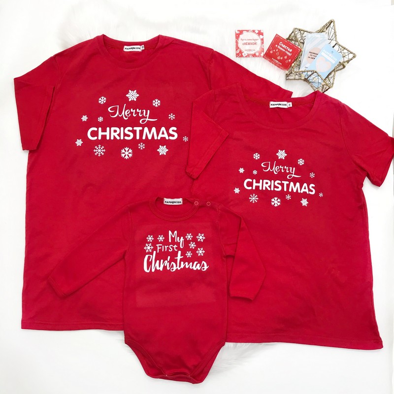 Новорічні футболки в одному стилі з оригінальним написом найкращий вибір для всієї родини ідеально підходить одяг на перший Новий рік дитини. Також чудова ідея для подарунку, сімейної фотосессії або новорічного родинного свята.