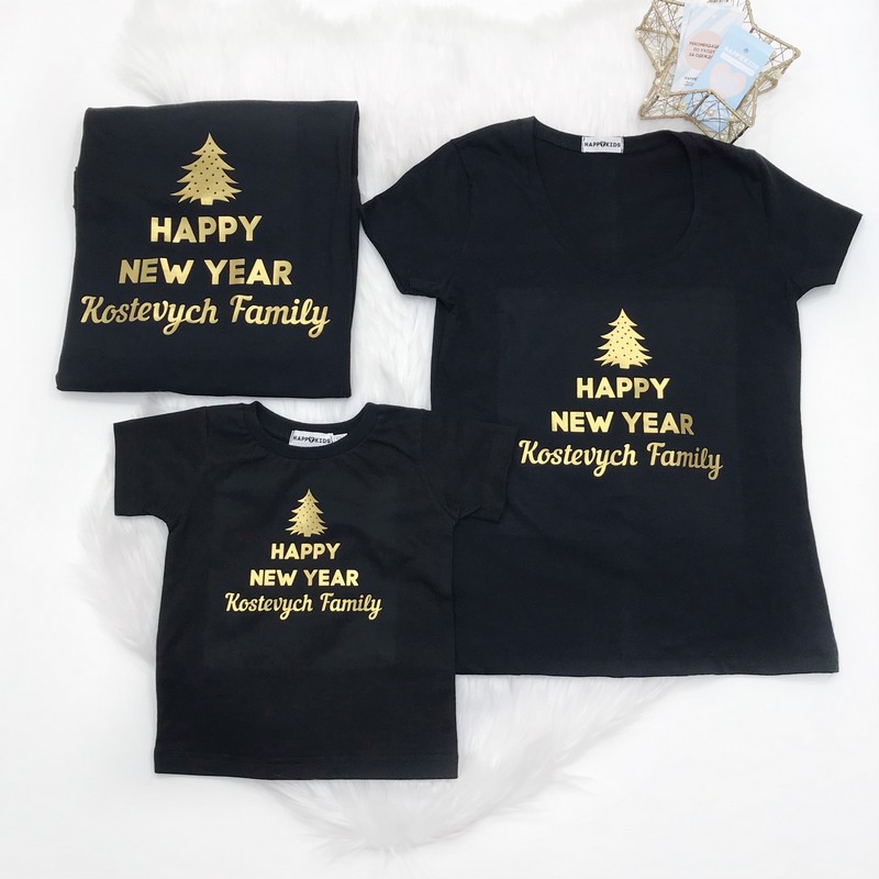 Набір сімейних новорічних футболок "Happy New year" іменний family чорний