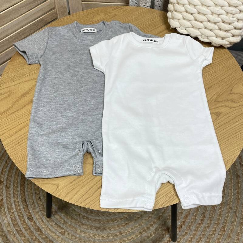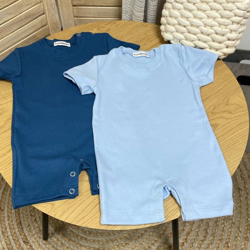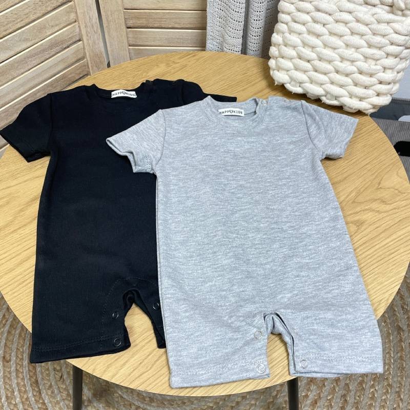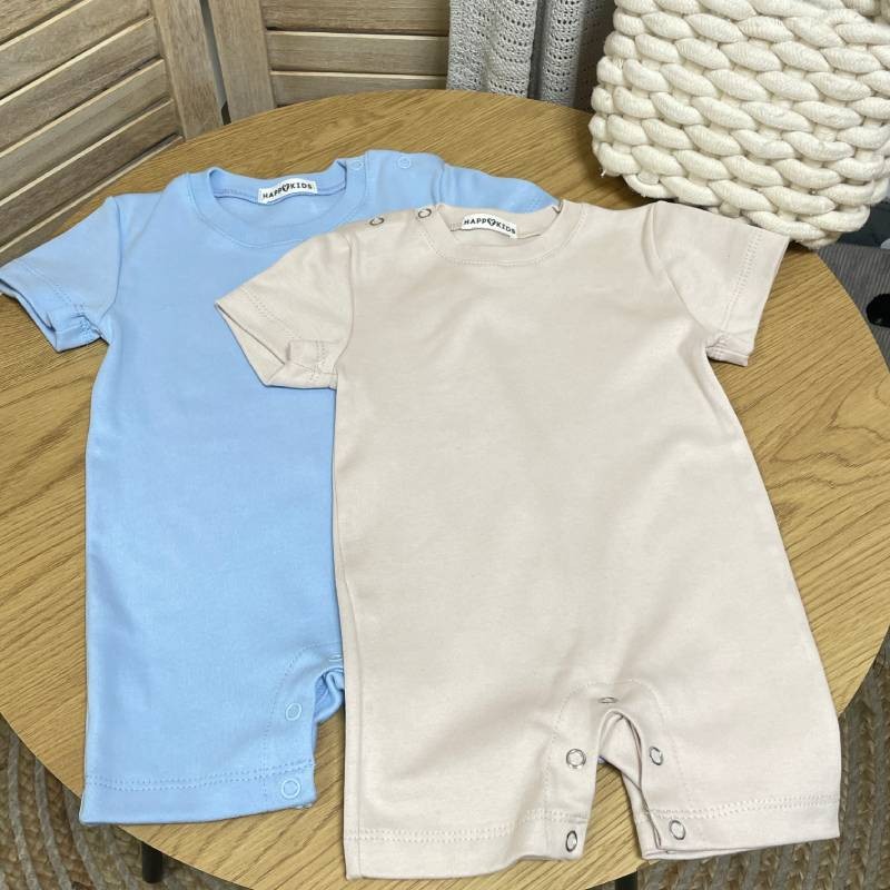 - Дизайн: у комплект входять два пісочники різного кольору. Обидва мають зручний фасон з коротким рукавом і шортиками. Застібки-кнопки по низу забезпечують швидкий і легкий доступ до підгузка, а м’який еластичний виріз не тисне на шию. Ромпери оформлені у спокійній палітрі — ідеально для першого гардеробу малюка.