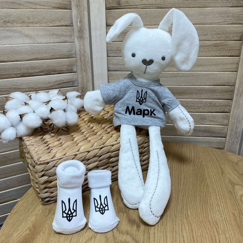 У наборі: Зайчик з іменем дитини та шкарпетки з тризубом