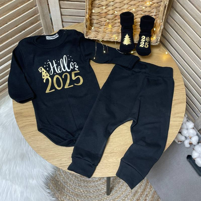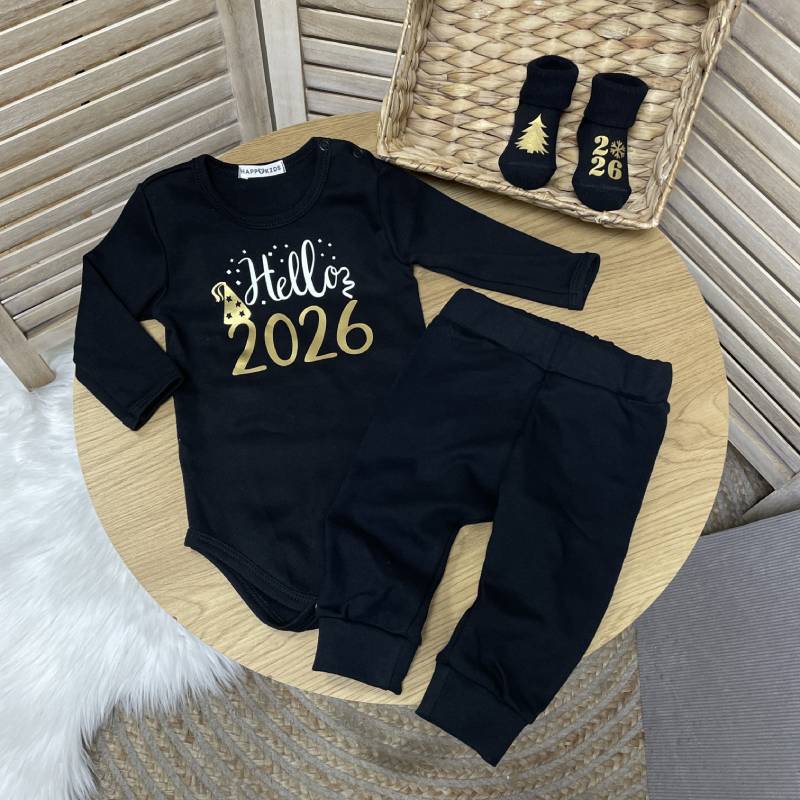Боди украшен праздничной надписью "Hello 2026", что делает ее идеальным выбором для новогодних праздников и семейных фотосессий.