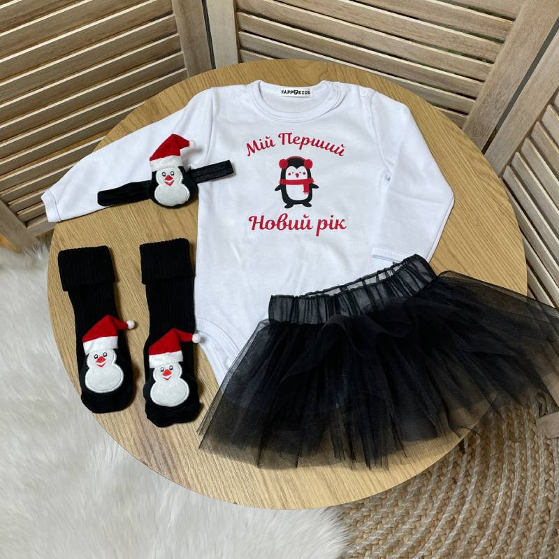 Боди новогодний с надписью "Мой Первый Новый Год" и веселым рисунком пингвина – идеальный выбор для ребенка этого праздничного сезона.