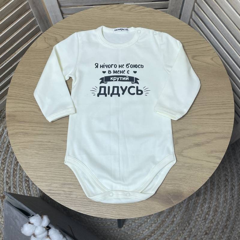 Этот милый боди — настоящая находка для тех, кто ищет оригинальный подарок новорожденному или хочет подчеркнуть теплые отношения между дедушкой и внуком или внуком. Надпись "Я ничего не боюсь " дополнена милыми сердечками, что придает боди особый шарм.