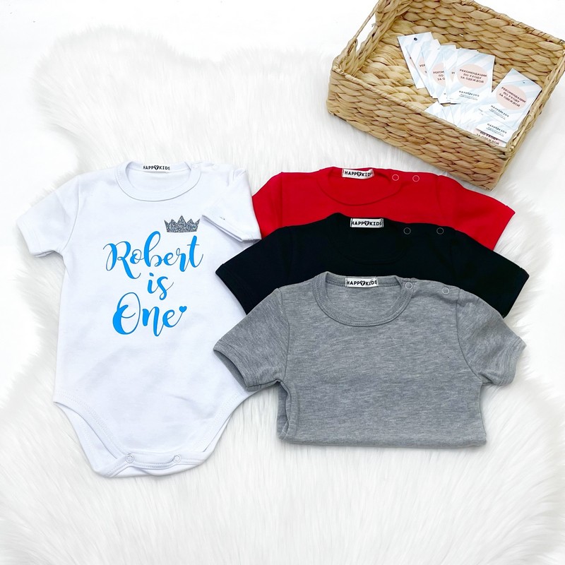 Качественный удобный однотонный боди с надписью для малыша подойдет для празднования и хороших памятных фото для семейной фотосессии.