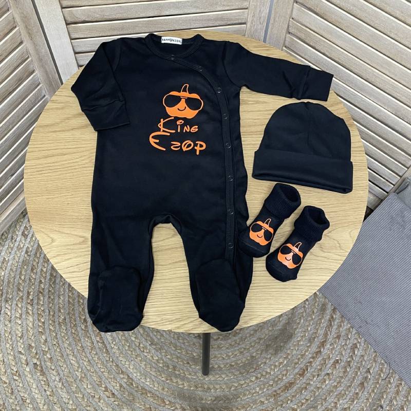 Человечек-слип для новорожденного мальчика с именем и милой тыквой на Хэллоуин - праздничный и практичный выбор для первых праздников малыша. Мягкий материал и удобный крой обеспечивают комфорт и легкую переодевание, а персонализированная надпись делает этот слип уникальным подарком.