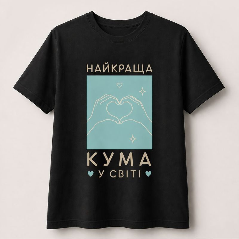 Дизайн: футболка с надписью «Лучшая кума в мире» или «Лучший кум в мире», минималистичный принт в современном стиле.