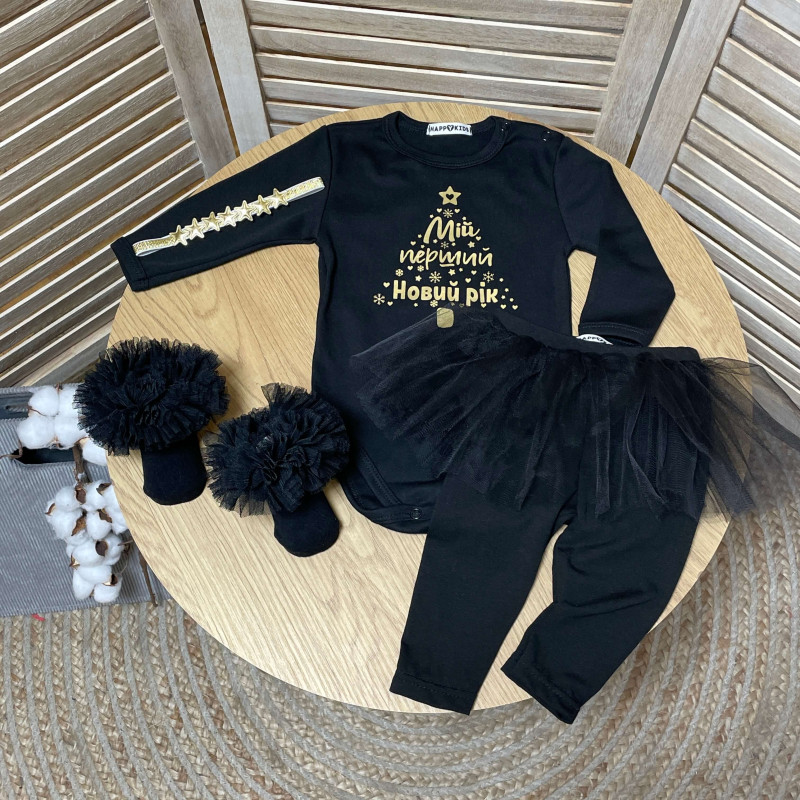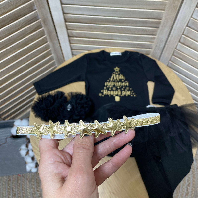 В комплекте: Черный боди с золотой надписью, лосины с юбочкой, носочки с рюшей, повязка со звездочками.