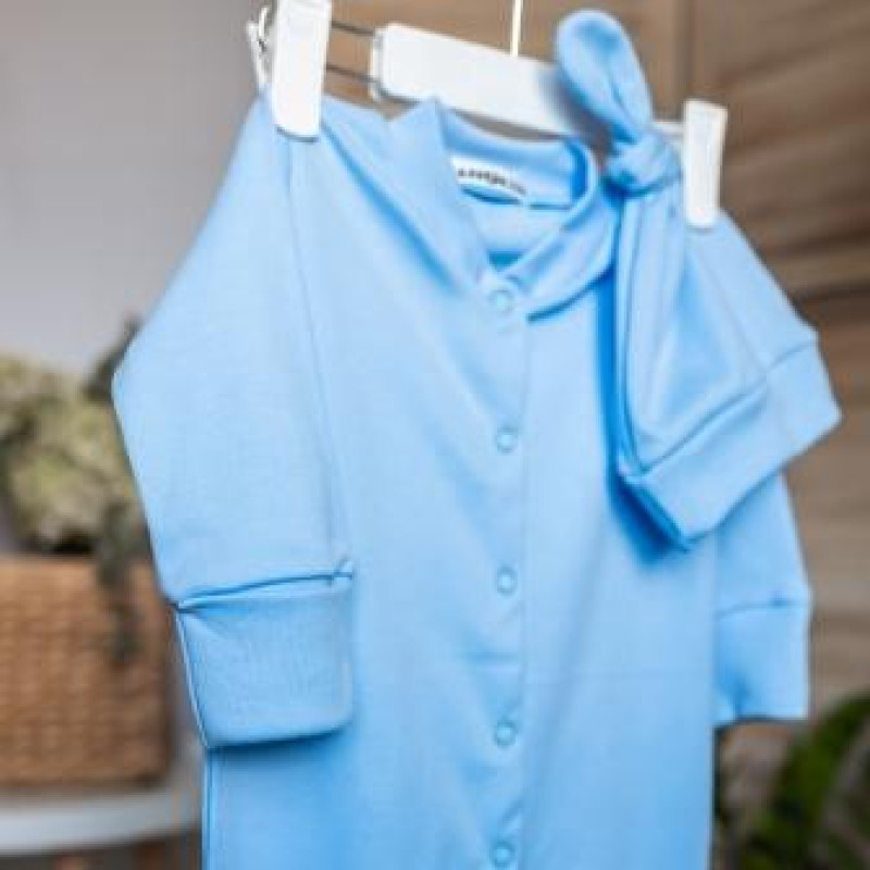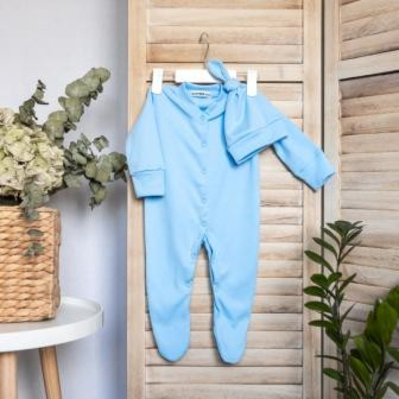 Удобный человечек на легко застегивающихся кнопочках и милая шапочка с узелком в тон.