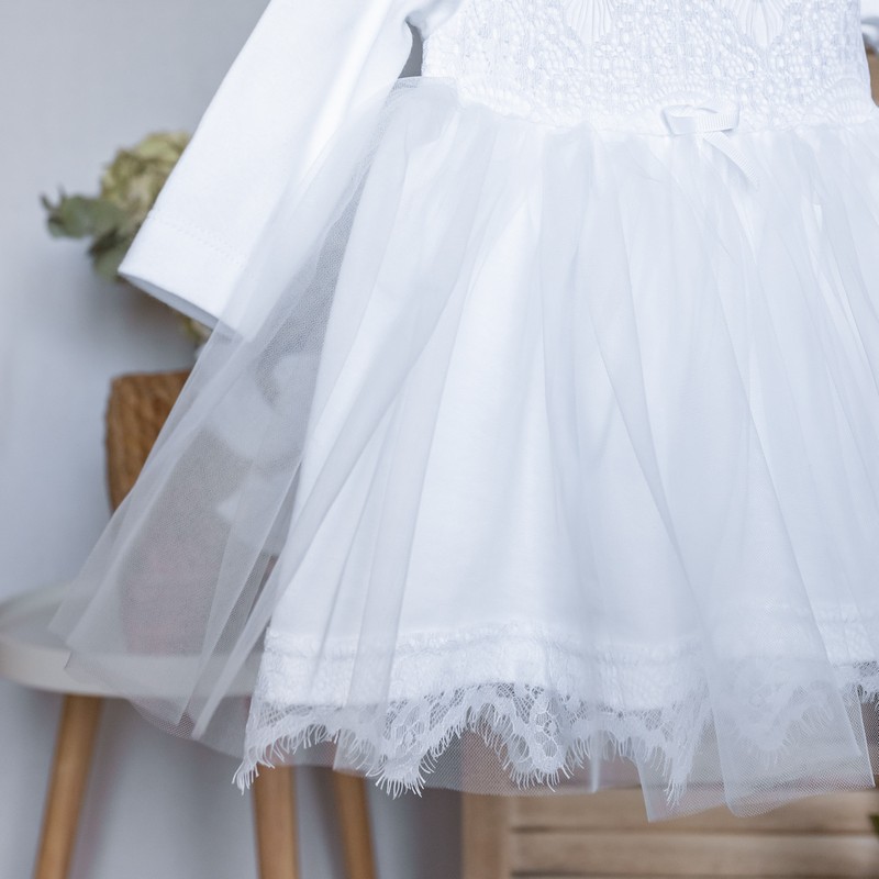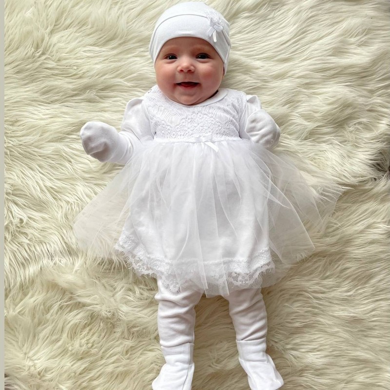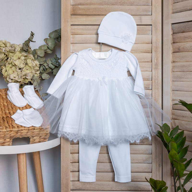 Красивый нарядный комплект для девочки новорожденной состоит из 5 позиций: Нежной платье с мягким кружевом, милые лосинки, комфортная шапочка, антицарапки на ручки, топики на ножки.