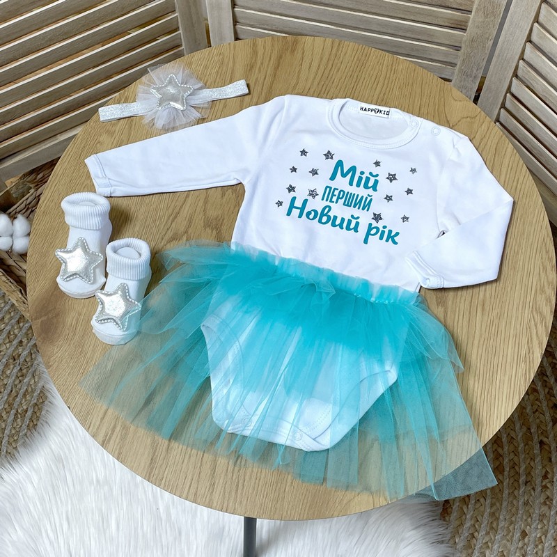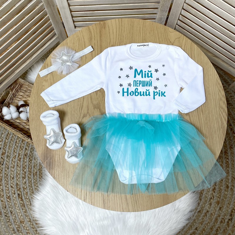В комплекте: Боди с пришитой юбочкой длинный рукав, носки, повязка