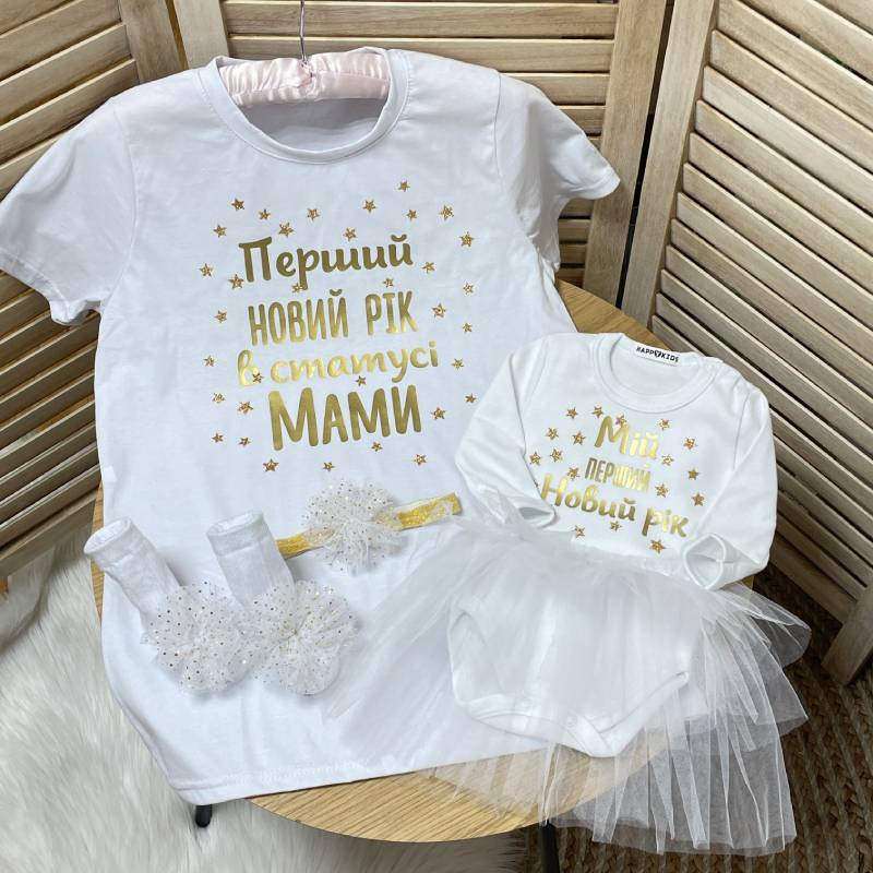 Праздничный комплект одежды для мамы и дочери с надписью «Первый Новый год» – семейный сет, создающий волшебное настроение и подчеркивающий самые ценные мгновения вместе. Идеальный выбор для праздничных фото, встреч Нового года и семейных подарков.