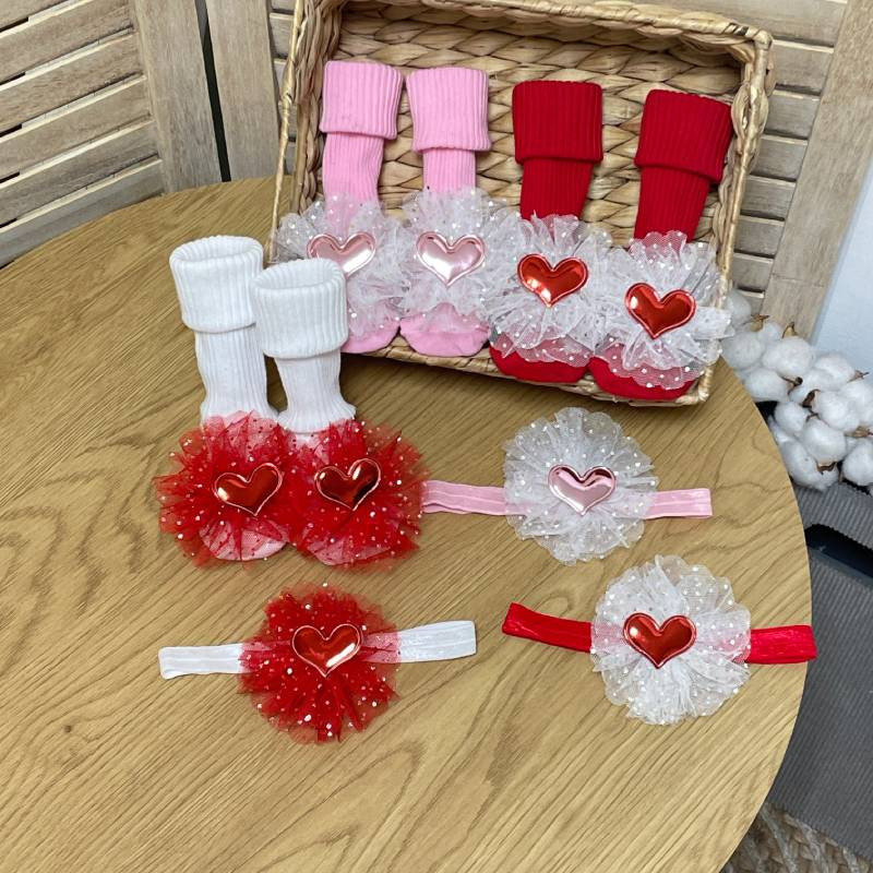 Роскошный комплект аксессуаров для новорожденной девочки. Повязка и носки с сердечком – это больше, чем просто одежда, это стиль и забота о малыше.
