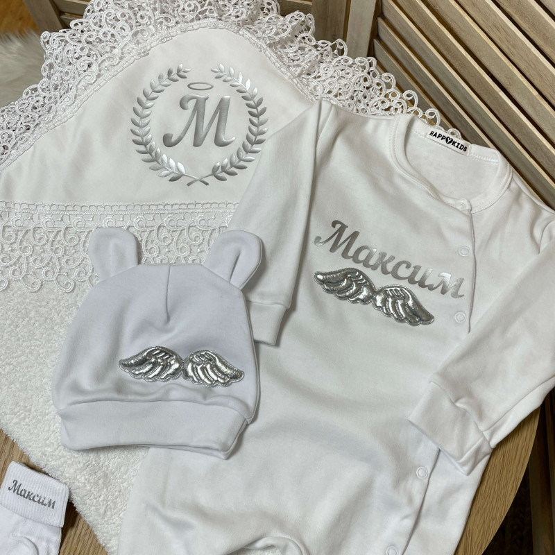 Этот крестильный набор именной, хорош как никакой другой во всех отношениях. Чего только стоит то, сколько предметов входит в комплект. Это комфортный человечек, теплые носочки, шапочка, и конечно же крыжма. При этом, каждый из них является именным. И мы можем предложить вам нанести на него любую надпись. Начиная от имени, и заканчивая поздравительными словами. Поэтому, такой крестильный набор способен не просто оправдать, но и превзойти все ваши ожидания.