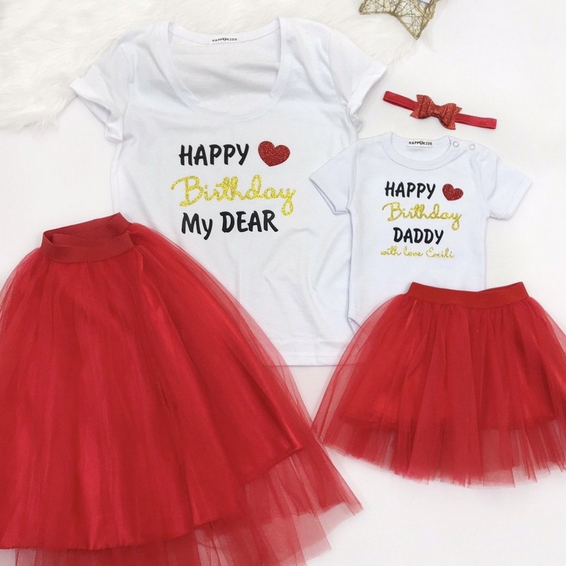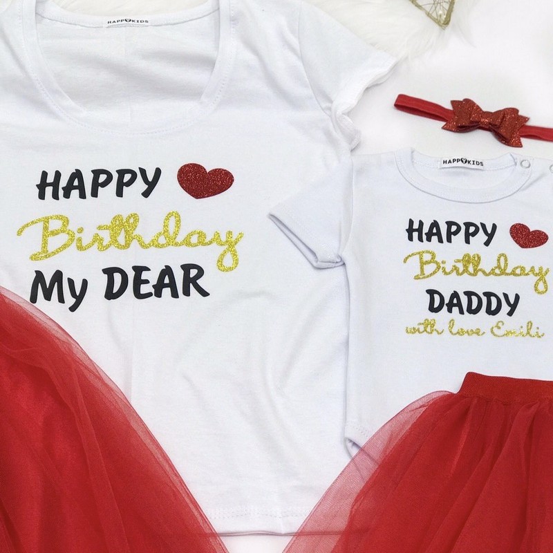 Оригинальный и стильный подарок, который создаст незабываемую атмосферу праздника! Этот набор, включающий в себя женскую футболку и боди для малыша, идеально подходит для семейного поздравления. Элегантная надпись "Happy Birthday My Dear" украшена глиттером, добавляя блеска и торжества момента.