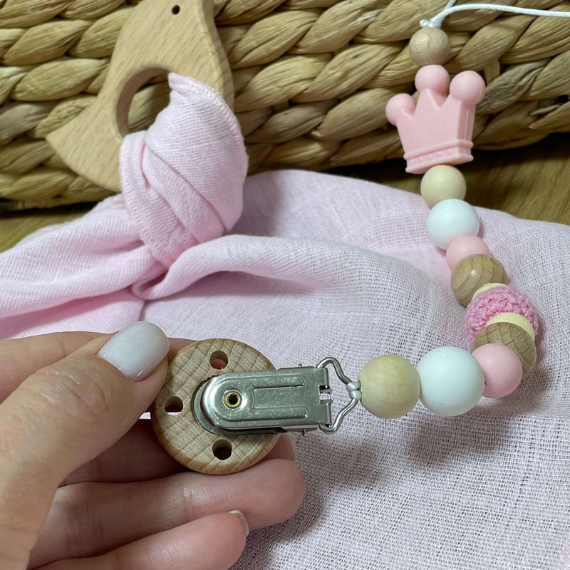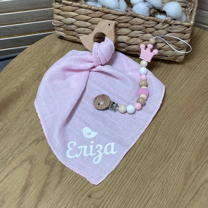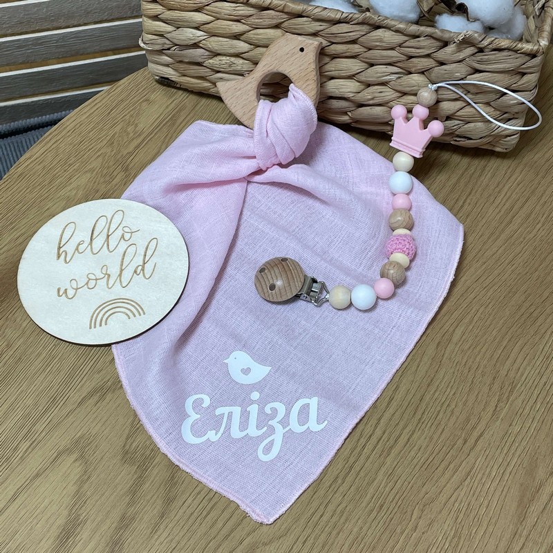 Набор новорожденному, включающий силиконовый именный платок грызунок, держатель для соски и деревянную карточку для фото с надписью "Hello world"
