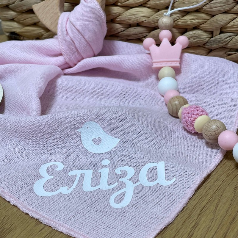 Именный грызунок персонализирован с именем вашего ребенка, что делает его отличным подарком на рождение или крестины. Кроме того, в комплекте с грызунком идет деревянная птичка с платком муслин, который может быть использован как дополнительный грызунок или как обычная игрушка.