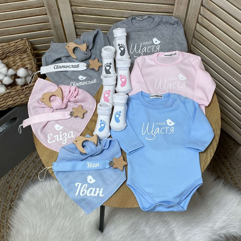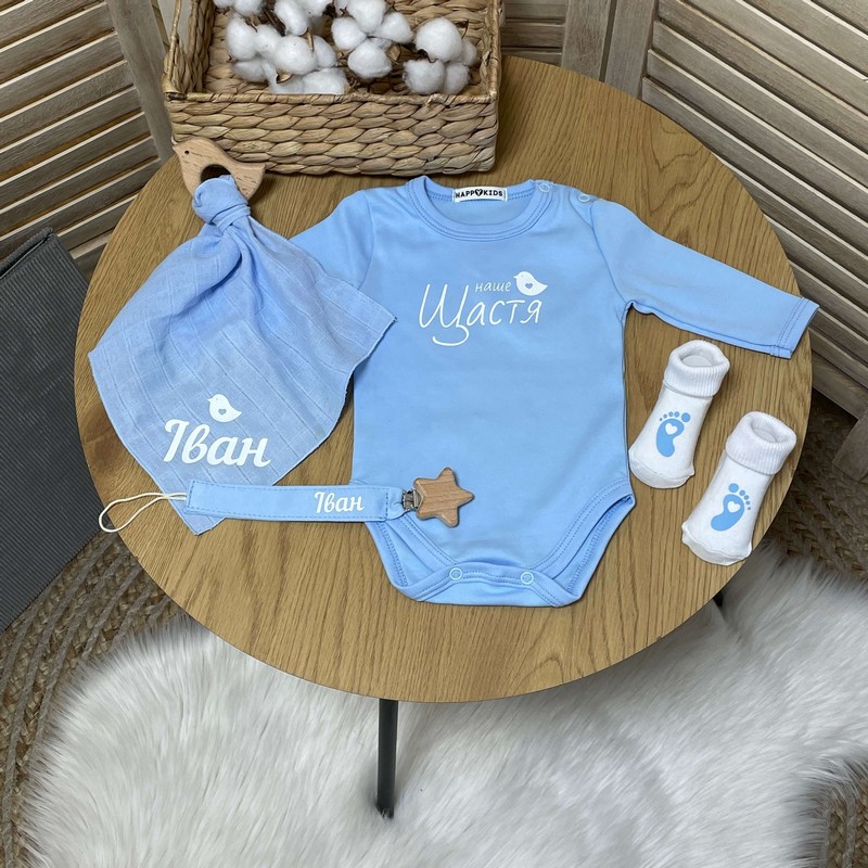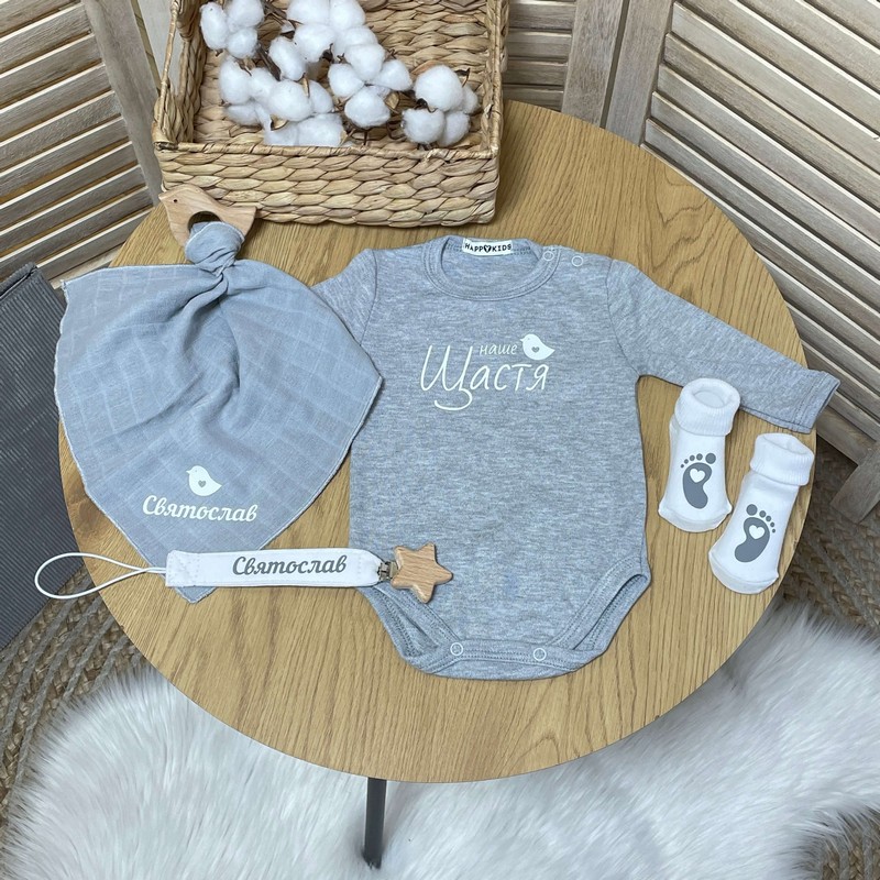 Набор новорожденному с боди именной держатель, грызунок, носочки