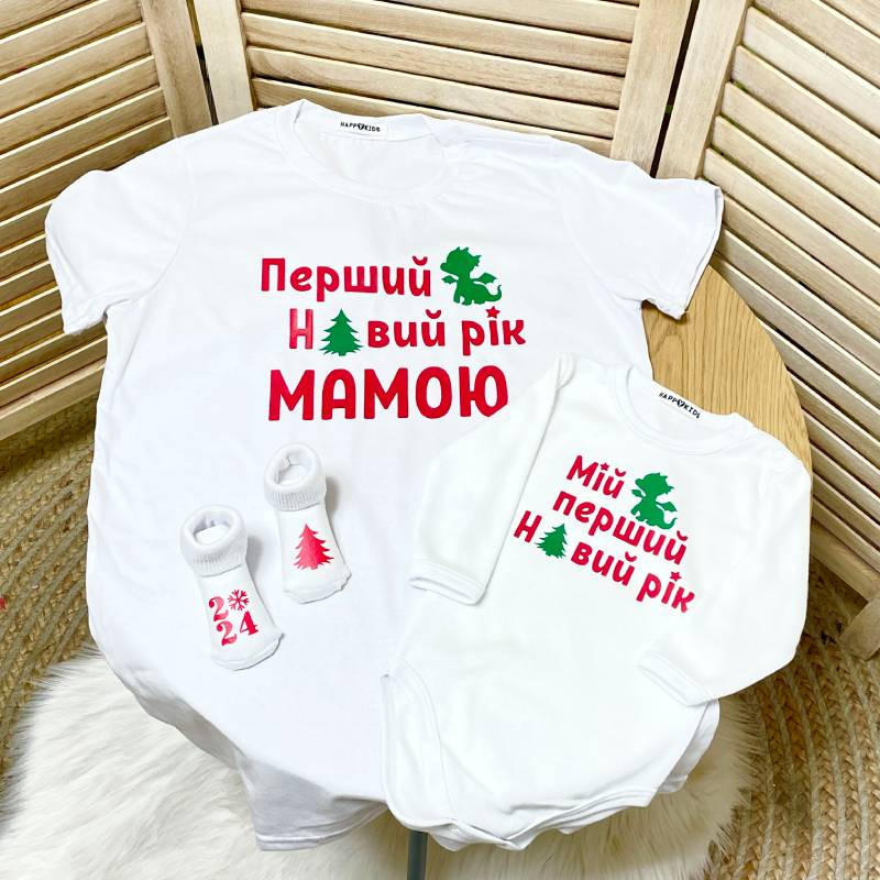 Встречайте праздник в стиле и комфорте с особым набором "Первый Новый год" с символом года! Это идеальный выбор для создания праздничного настроения и незабываемых семейных фотографий. Набор включает в себя стильную футболку для мамы и уютное боди для ребенка, оформленные праздничным дизайном, который полон тепла и магии новогодней ночи.