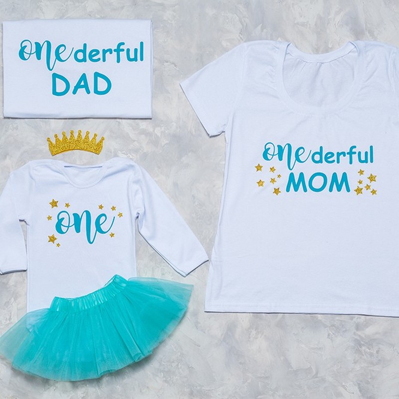 Нарядные оригинальные футболки для всей семьи - прекрасный выбор на первый день рождения ребенка.
