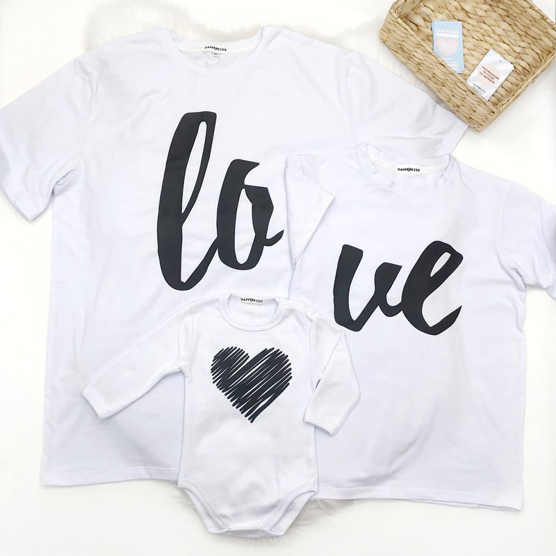 В комплекте три футболки - мужская, женская, детский боди с длиной рукава на выбор.