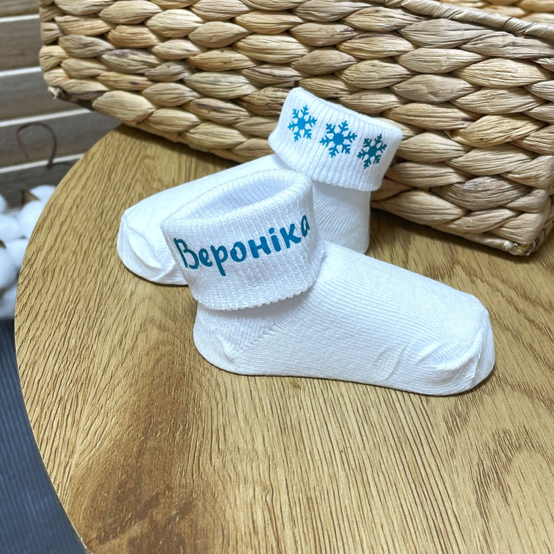 Новогодние носочки для малышей с именем и снежинками белые