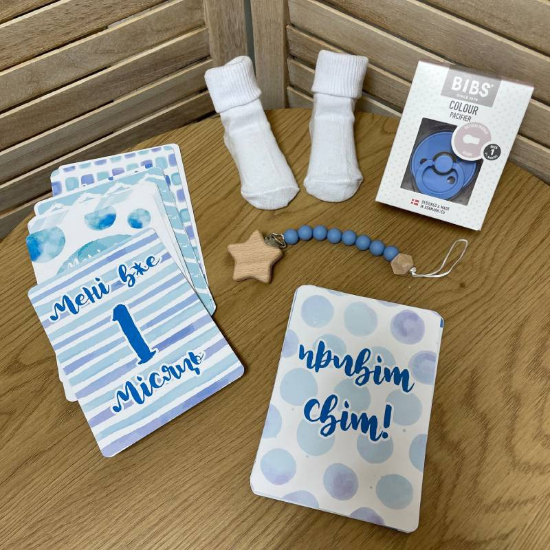 Подарочный набор новорожденного с картами для фото синие акварели
