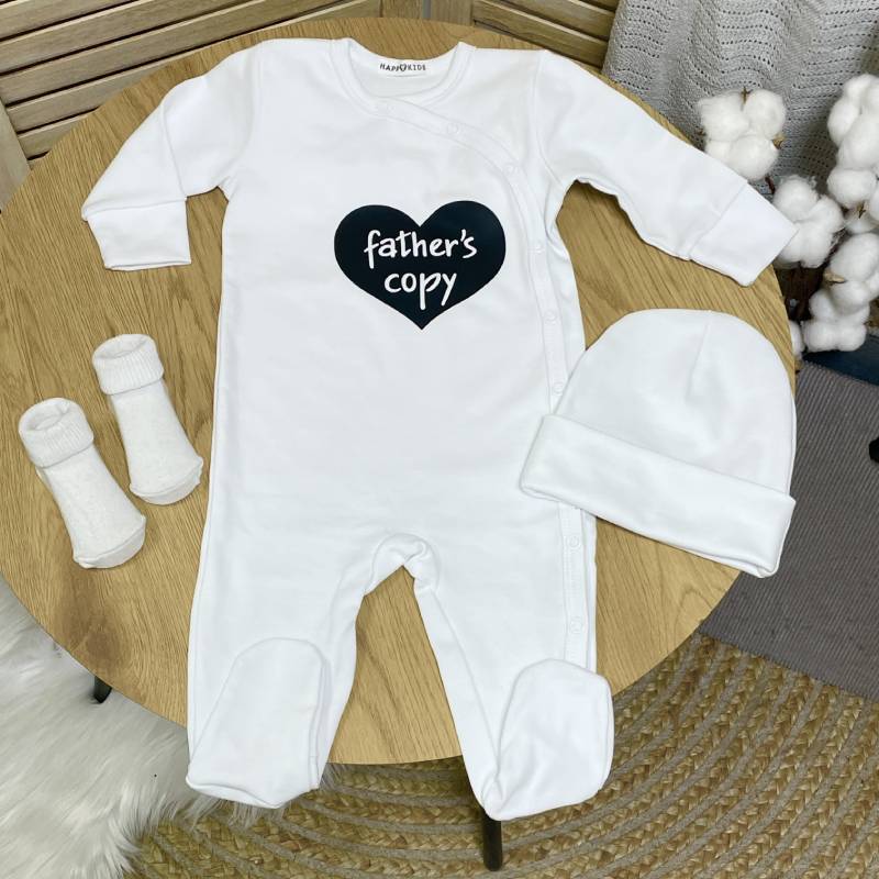 Слип-человечек для новорожденного с надписью "Father's copy" в виде сердечка - стильная и трогательная одежда для малыша, подчеркивающая особую связь с папой ????. Модель представлена в разных базовых цветах, что позволяет выбрать идеальный вариант для мальчика или девочки. Такой слип для новорожденного отлично подходит для выписки из роддома, фотосессий и ежедневного ношения. Если вы ищете человечек, слип с надписью для малыша или оригинальный подарок папе – это идеальный выбор.