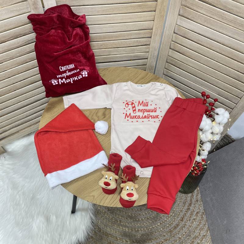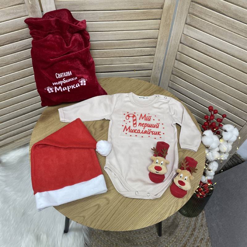Праздничный набор для новорожденного мальчика с надписью "Мой первый Николайчик" - идеальный образ для волшебных зимних праздников, семейных фотографий и первого знакомства малыша с Николаем. Нежный, теплый и очень стильный комплект поможет создать теплую атмосферу, наполненную любовью и праздничным настроением.