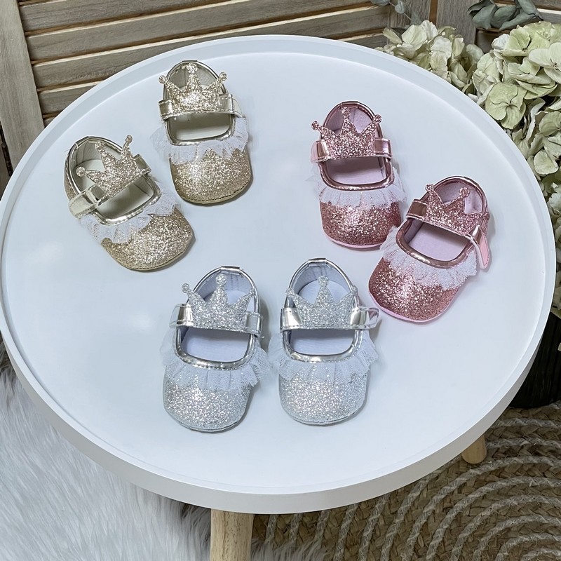 Стильные нарядные пинетки для новорожденной девочки с короной для малышек дополнят образ любой принцессы. Красивые пастельные цвета и невероятно красивый блеск глиттер
