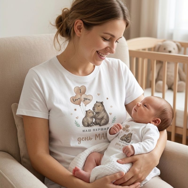 Дизайн: ніжний тематичний принт із капібарою та написом «Наш перший День Мами»; гармонійне поєднання кольорів для стильного family look.